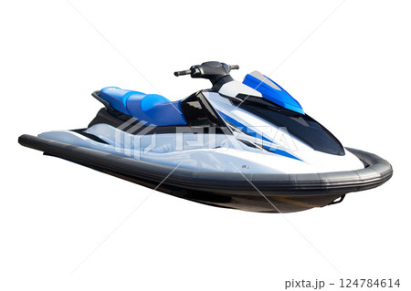 Fast and powerful watercraft used for recreational purposes in sea oceans and rivers, blue black jet ski isolated on white background