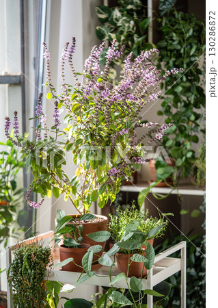 Blooming thai Basil bush plant in clay pots at home. Cultivation homegrown spicy herbs