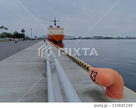 穏やかな海に停泊する南極観測船「しらせ」 2025.11 横浜, 日本