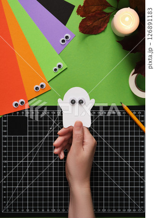How to make a simple paper craft. An idea for hobbies and creativity. A hand holds a finished paper ghost.
