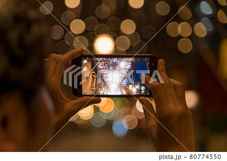 スマホでイルミネーションを撮る女性