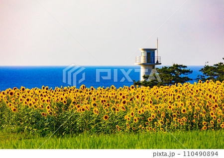 【新潟県_佐渡島_小田】日本海とひまわり畑 8月
