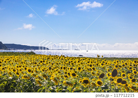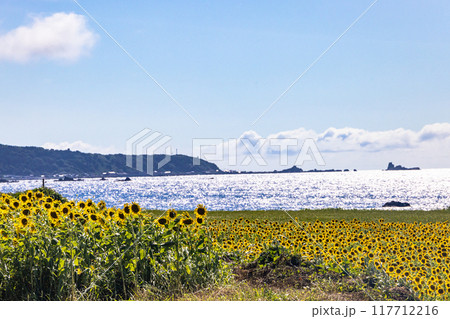 【新潟県_佐渡島】真夏の青い海と青い空とひまわり 7月 8月