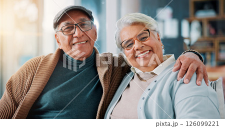 Senior couple, portrait and love in home with smile, bonding and healthy relationship in retirement. Elderly man, mature wife and hug in living room with commitment, relax and support in marriage