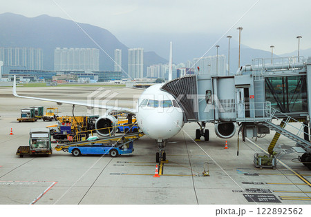 Airport baggage tug (baggage dolly transport) on duty and Ground Service fuel truck Refueling an aircraft at aircraft bay.