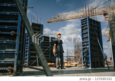 Standing with grinding machine in hands. Man in uniform is working on the construction site