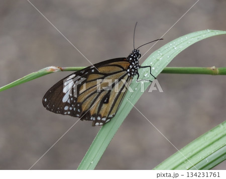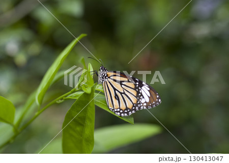 植物の葉にとまるオレンジ色の蝶のスジグロカバマダラ