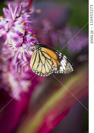 蝶がピンク色の花の蜜を吸っています。蝶の名前はスジグロカバマダラです。