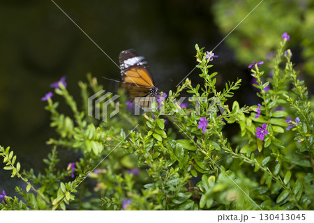 蝶が紫色の花の蜜を吸っています。蝶の名前はスジグロカバマダラです。学名はDanaus genutia
