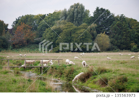 イギリスの牧草地に立つ白いと羊
