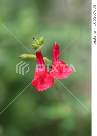 一対で咲く赤いチェリーセージの花(ホットリップス・マクロレンズ使用・自然光・接写写真)