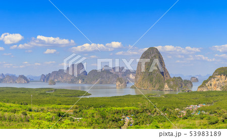 panorama view of mountains in Phangnga bay with mangrove forest in andaman sea Thailand