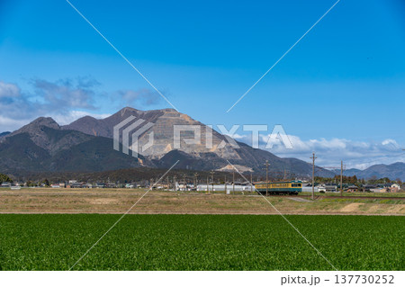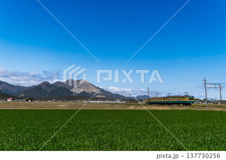 藤原岳を背景に快晴の中を走る三岐鉄道三岐線の緑色車両