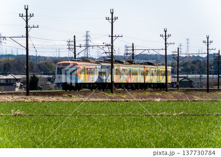 水田の横を走る三岐鉄道の北勢線の電車
