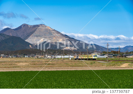 畑の中を走り抜ける、三岐鉄道 三岐線の電車(旧、西武鉄道車両)