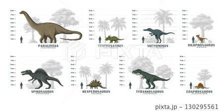 8 bit pixel dinosaurs infographics with dino animals size comparison chart. Vector pixel art tyrannosaurus, spinosaurus, dilophosaurus and suchomimus dinosaurs height comparison to human infographics