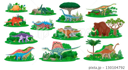 Prehistoric dinosaurs and jurassic reptiles cartoon characters. Vector dino animals and prehistoric forest trees. Cartoon cute tyrannosaurus, mammoth, spinosaurus, ankylosaurus and euhelopus dinosaurs
