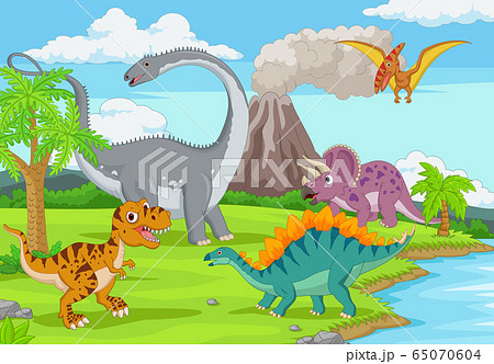 Group of funny dinosaurs in the jungle