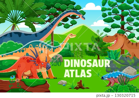 Prehistoric dinosaurs atlas book cover vector template with cartoon dino animals. Funny jurassic tyrannosaurus, styracosaurus and shunosaurus dinosaur characters at prehistoric jungle forest landscape