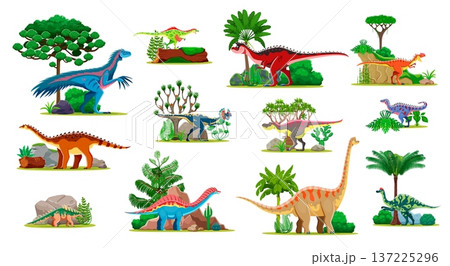 Prehistoric dinosaurs in their natural habitats. Vector scenes include species like sauropods, theropods, and ornithopods surrounded by lush vegetation, rocks and ancient trees, at the Mesozoic era