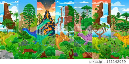 Cartoon prehistoric dinosaur characters collage. Vector dino species sauropods, triceratops, ankylosaurs and theropods in jungle landscapes with volcanoes, waterfalls and lush vegetation on background