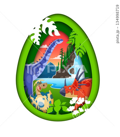 Paper cut dino egg with cartoon funny prehistoric dinosaurs. Green dinosaur egg cutout showing prehistoric scene with blue sauropod, red triceratops and baby dinosaur hatching