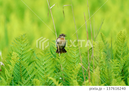 サロベツ原野の草原で草にとまるノビタキ 北海道の野鳥