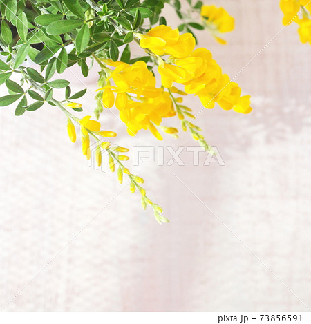 初夏の黄色の花 鉢植えのエニシダ(白木板の背景)