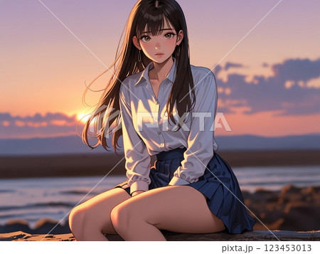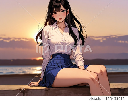 海岸に座る女性のイラスト