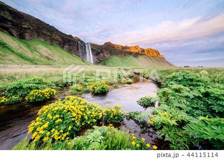 Seljalandsfoss waterfall flowing with yellow flower blooming in summer at Iceland