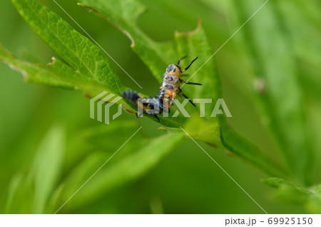春の日本の野原で緑の葉っぱに止まるナナホシテントウムシのさなぎ