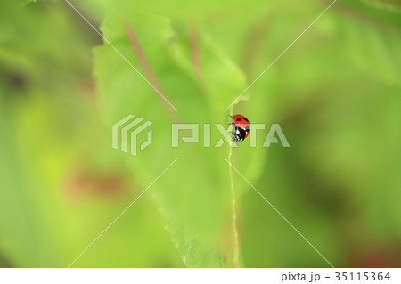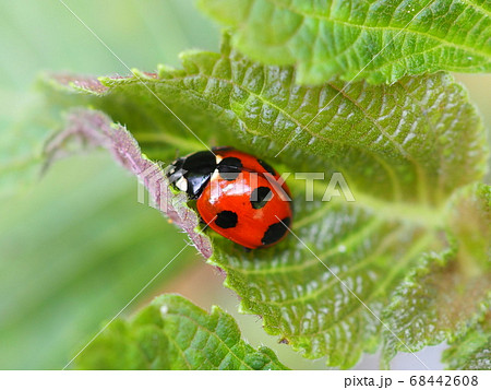 日本の春の野原で緑色の葉に止まるナナホシテントウムシ