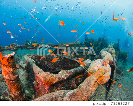 第二次世界大戦の沈船のアンカーウインチとキンギョハナダイ (シャルムエルシェイク、紅海、エジプト)