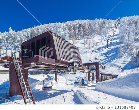 山頂へ向かうスキーリフト乗り場と冬の美しい樹氷の森 (長野県、志賀高原、横手山)