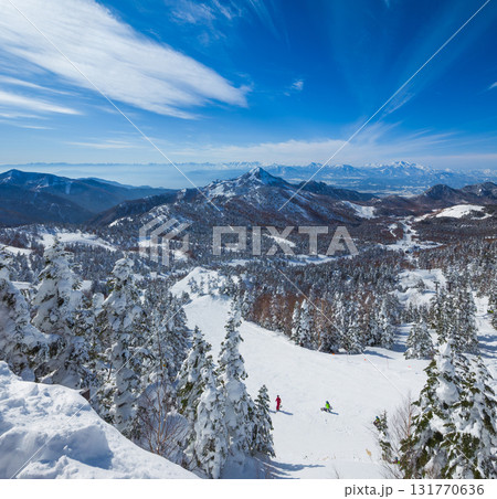 スキー場の高所から見渡すゲレンデと雪山のパノラマ絶景 (長野県、志賀高原、横手山)