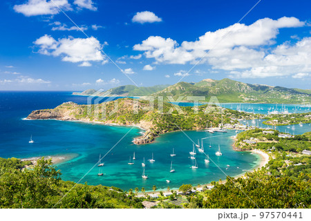 View of English Harbor from Shirley Heights, Antigua, paradise bay at tropical island in the