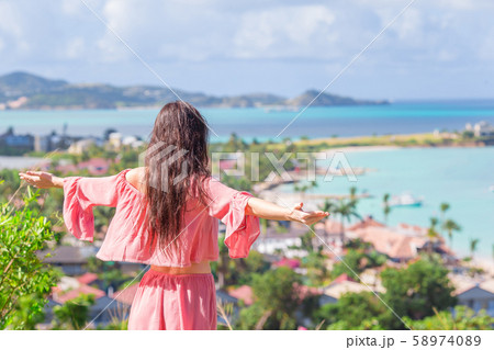 Young tourist woman with view of bay at tropical island in the Caribbean Sea