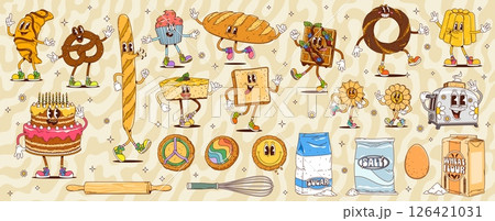 Cartoon groovy bakery, bread and pastry characters, vector retro hippie cereal food. Funny wheat bread, baguette, croissant and bun, cake, cupcake and cookie. Groovy toast, bagel and waffle characters