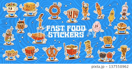 Groovy fast food characters stickers pack of vector drinks, desserts and snacks. Retro hippie egg sandwich, hot dog and fries, burrito, sushi, chicken legs and popcorn. Funny groovy takeaway fast food