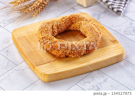 Turkish traditional bagel / simit with sesame on wooden table, turkish breakfast pastry concept