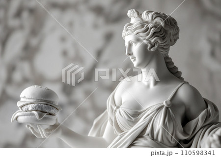 Ancient Greek goddess sculpture holding a burger. Female marble statue offers a cheeseburger. Fast food, overeating, bad diet, unhealthy eating habits concept, copy space. Restaurant menu mockup