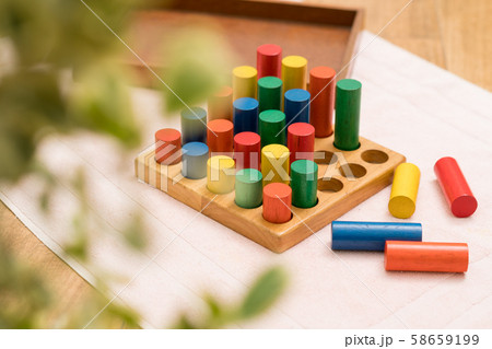 Top view closeup of colorful wooden Montessori sensorial material learning, Sizing and order block. Kindergarten educational toys, Thinking process, Cognitive skills, Learn Through Play tools concept.