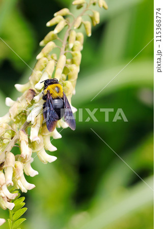 クサエンジュの花蜜を吸うメスのキムネクマバチ(自然光+マクロ接写写真)