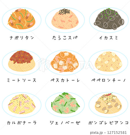 ペペロンチーノやイカスミやボンゴレロッソなどのいろいろな美味しいパスタのアイコン