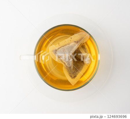 Herbal tea sachet in cup, hot water with chamomile and Hypericum or St. John's wort teabag