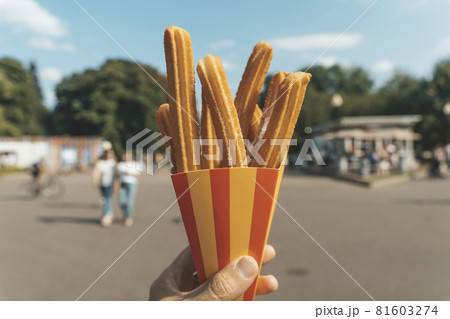 Churros waffles in hand on the street. Churros street food dessert made from dough and sugar. Fast food sweets