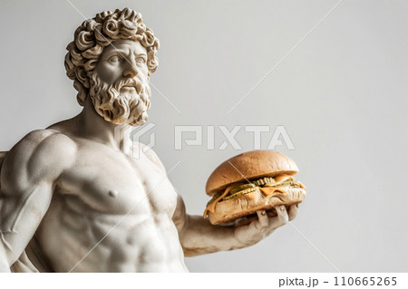 Ancient Greek god sculpture holding a burger. Fit man marble statue offers a cheeseburger. Fast food, overeating, bad diet, unhealthy eating habits concept, copy space. Restaurant menu mockup