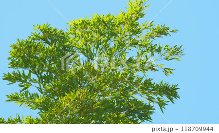 Fresh Green Dense Bamboo Forest Under Clear Blue Sky. Green Bamboo Tree With Clear Blue Sky.