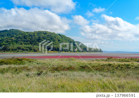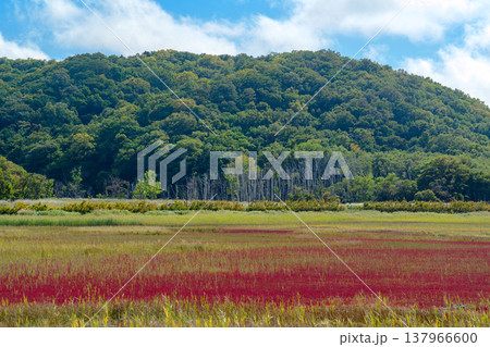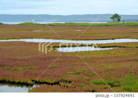北海道道東の塩性湿地に広がる紅葉したサンゴ草と美しい自然風景