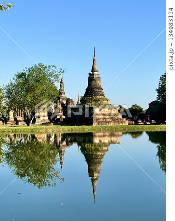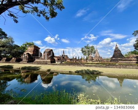 タイ北部の古都スコータイ 世界文化遺産スコータイ歴史公園のワットプラパーイルアン遺跡と池の水鏡